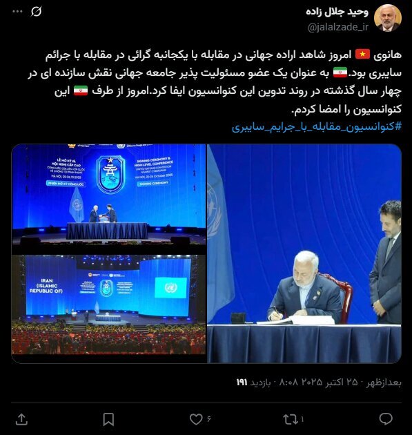 به گزارش خبرگزاری ایمنا، وحید جلال زاده در حساب کاربری خود در شبکه اجتماعی ایکس نوشت: هانوی امروز شاهد اراده جهانی در مقابله با یکجانبه گرایی در مقابله با جرایم سایبری بود.