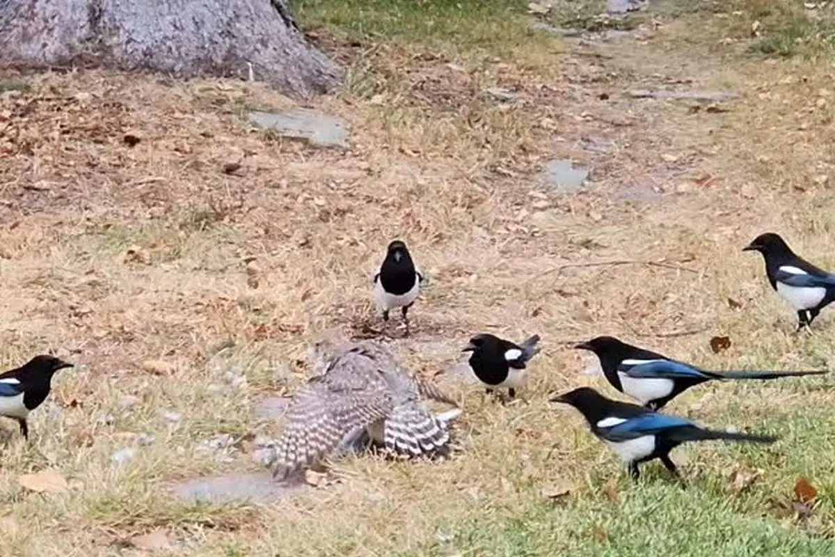 صحنهای شگفتانگیز در حیاط پشتی یک خانه از درگیری یک شاهین با چند زاغی بر سر یک شکار رقم خورد.